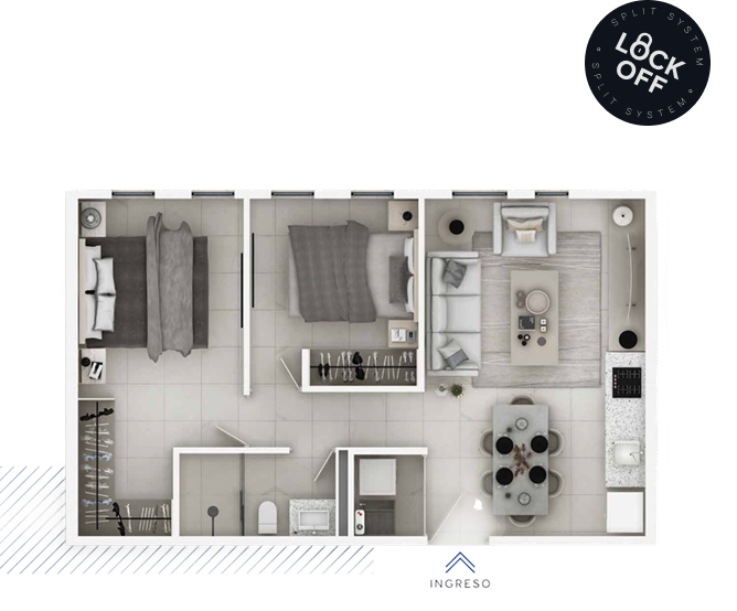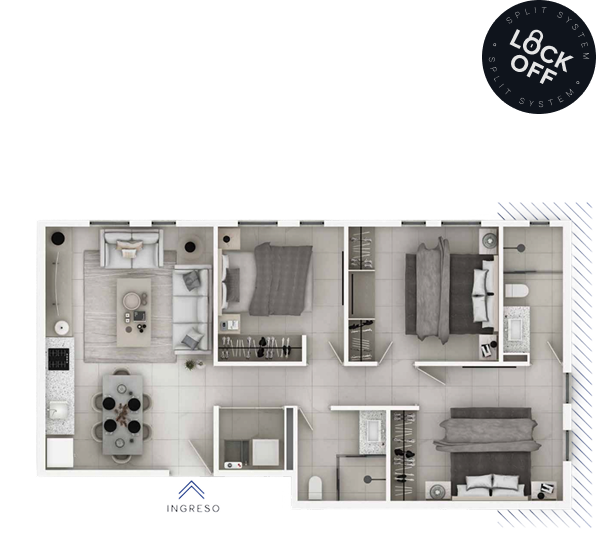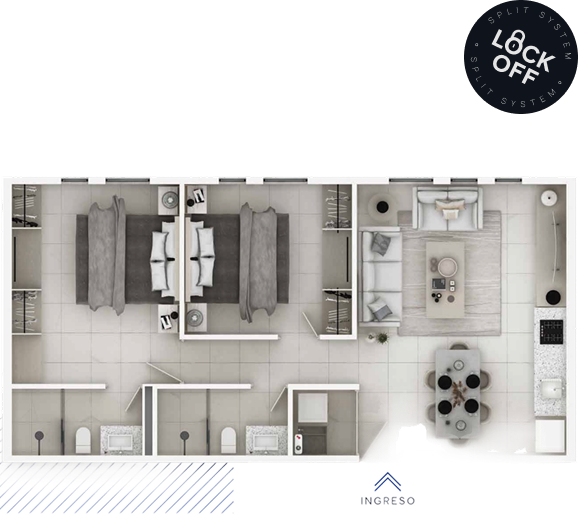 Nuestros departamentos integran el sistema Lock-Off: puedes dividir tu unidad en dos espacios independientes, lo que te permite rentar ambas áreas o vivir en una y rentar la otra. Tú eliges cómo maximizar tu inversión.